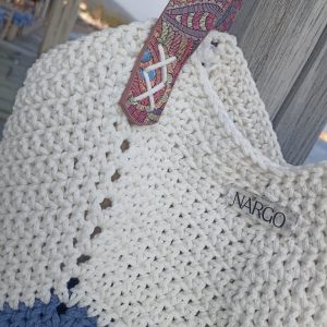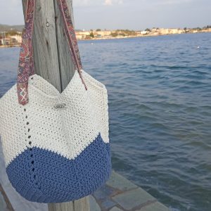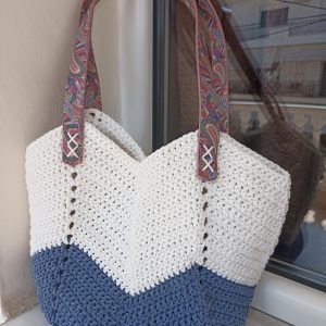 Χειροποίητη καλοκαιρινή τσάντα ώμου σε μπλε denim και εκρού.