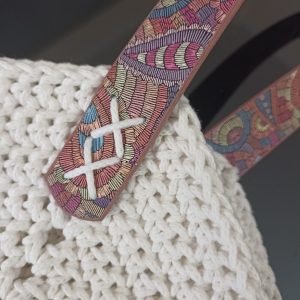 Διαθέτει λουράκια από οικολογικό δέρμα 70εκ. σε ροζ απόχρωση με τυπωμένα πολύχρωμα σχέδια πάνω τους που δίνουν όμως την εντύπωση κεντήματος. Κλείνει με μαγνητάκι.