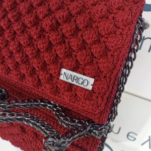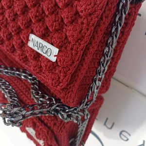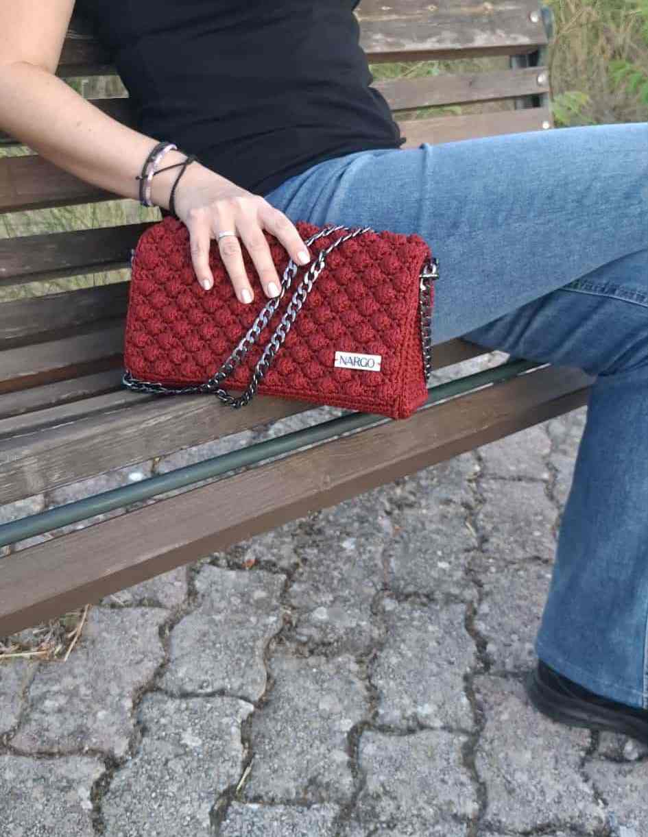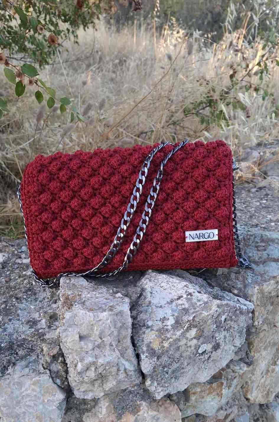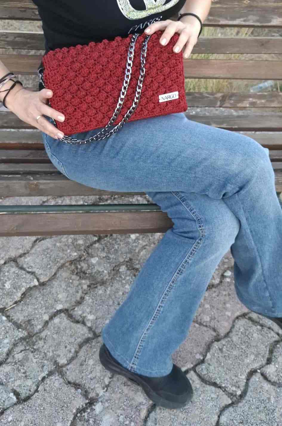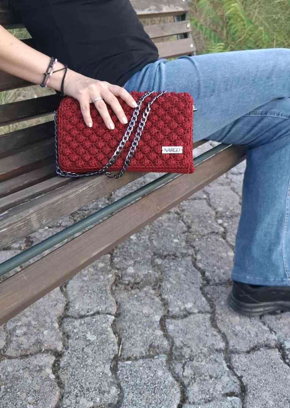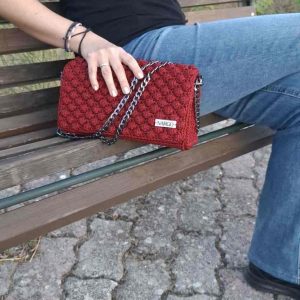 Χειροποίητη πλεκτή κόκκινη τσάντα ώμου / χιαστί, κατασκευασμένη από νήμα υψηλής ποιότητας σε βαθύ κόκκινο και μαύρα μεταλλικά στοιχεία.