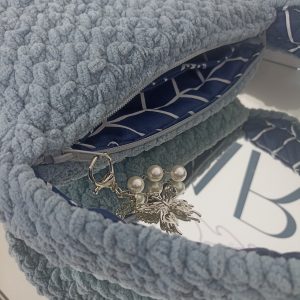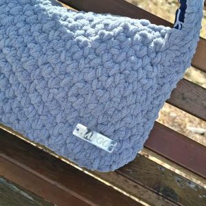 Χειροποίητη πλεκτή τσάντα ώμου κατασκευασμένη από βελουτέ νήμα σε γκρι-μπλε απόχρωση.