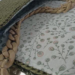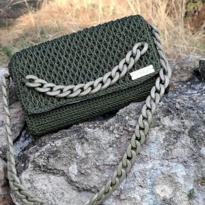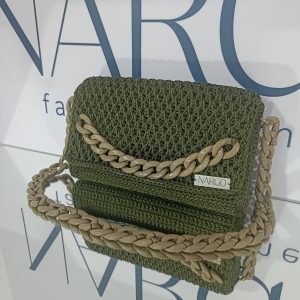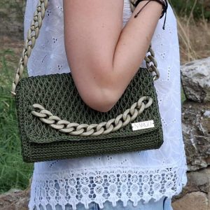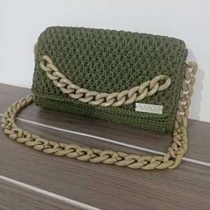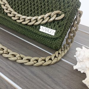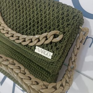 Χειροποίητη πλεκτή τσάντα ώμου σε λαδί απόχρωση με χακί κοκκάλινη αλυσίδα.