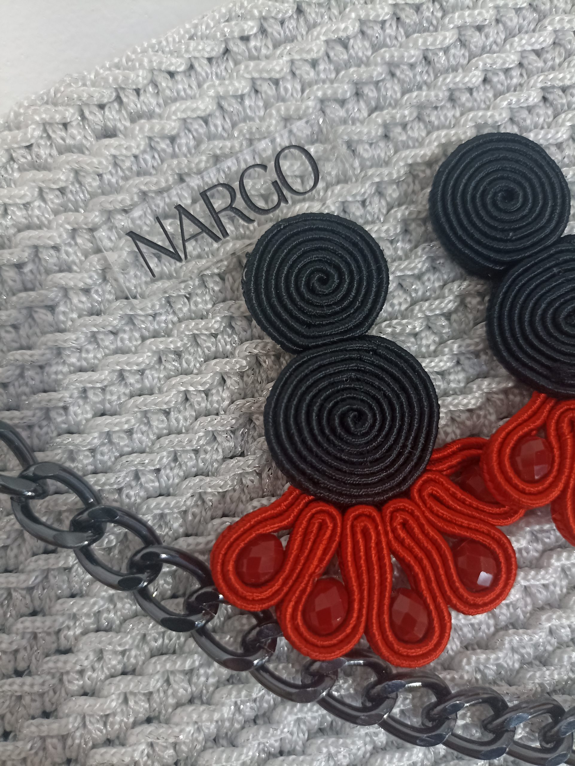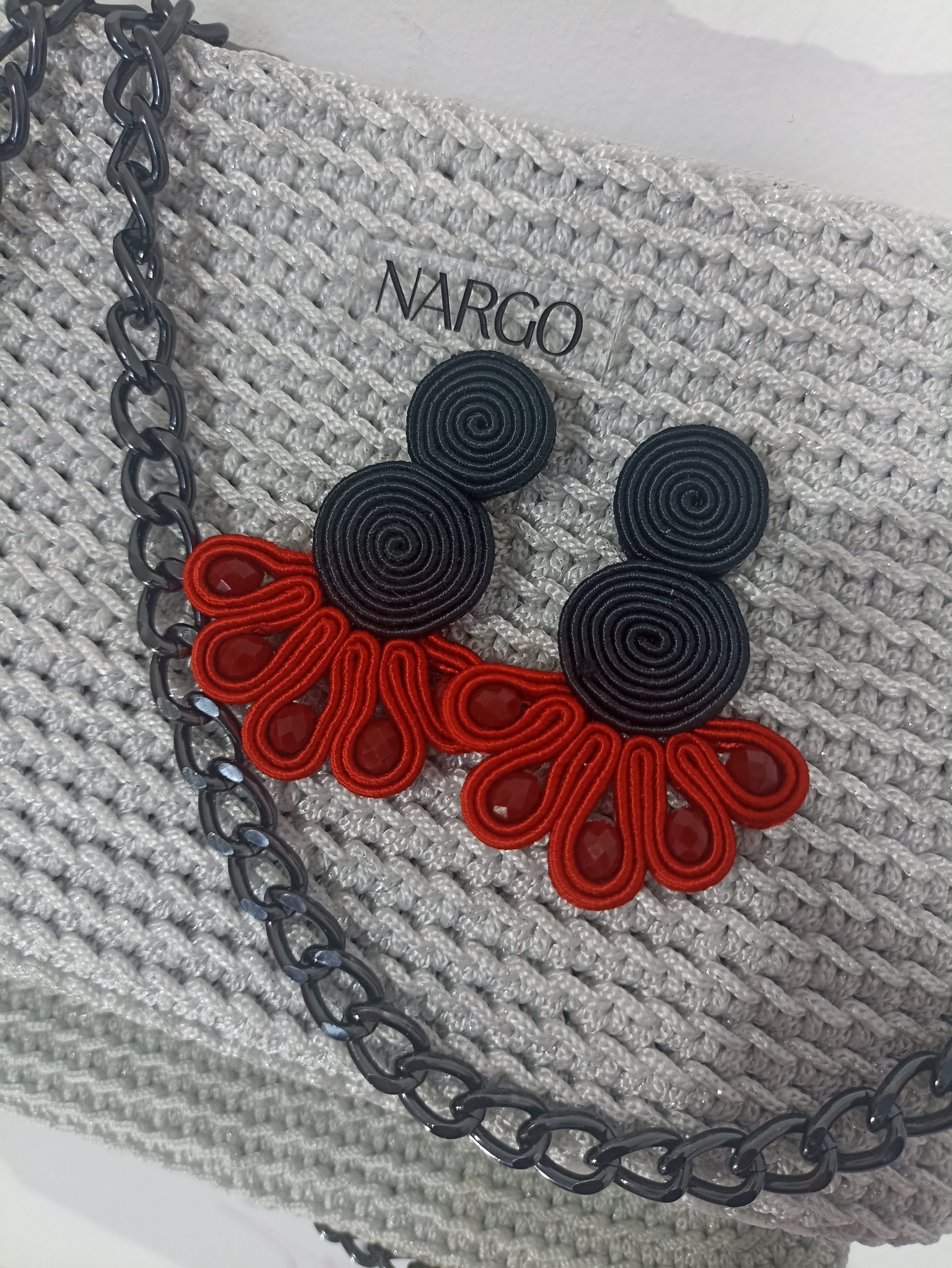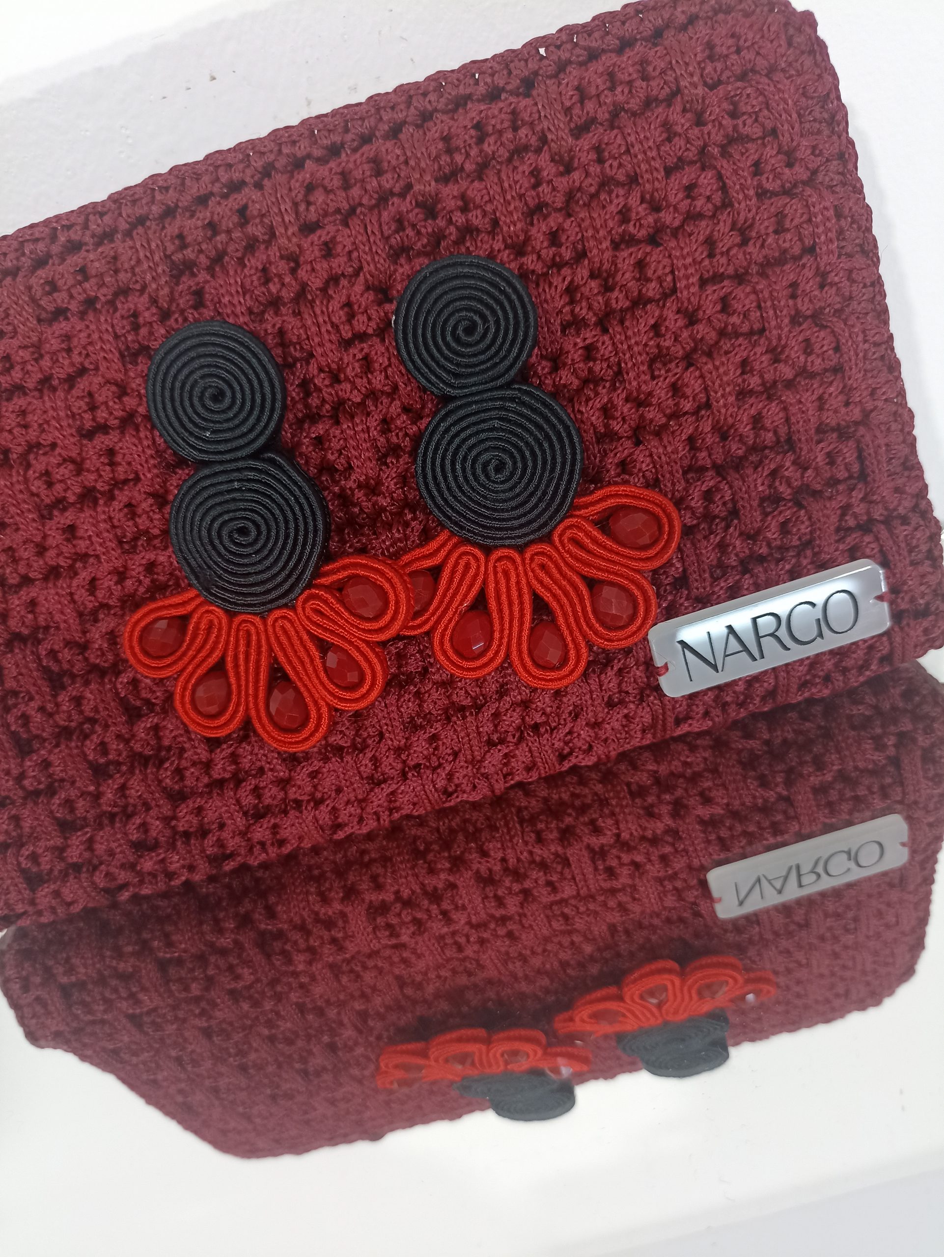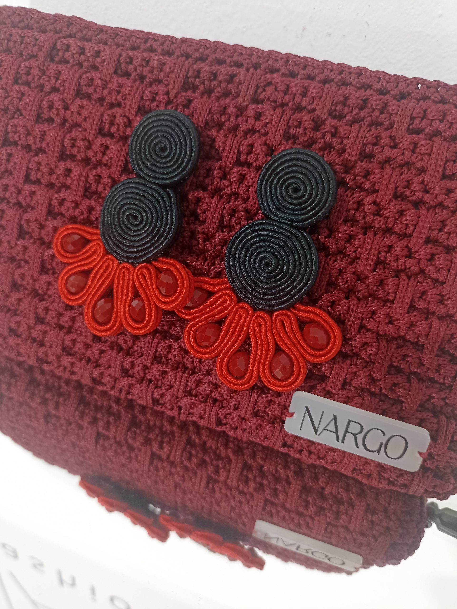 Από μεταξωτό μαύρο και κόκκινο κορδόνι σουτάζ, κόκκινες χάντρες και υποαλλεργικό ατσάλι στο κούμπωμα.