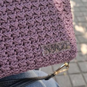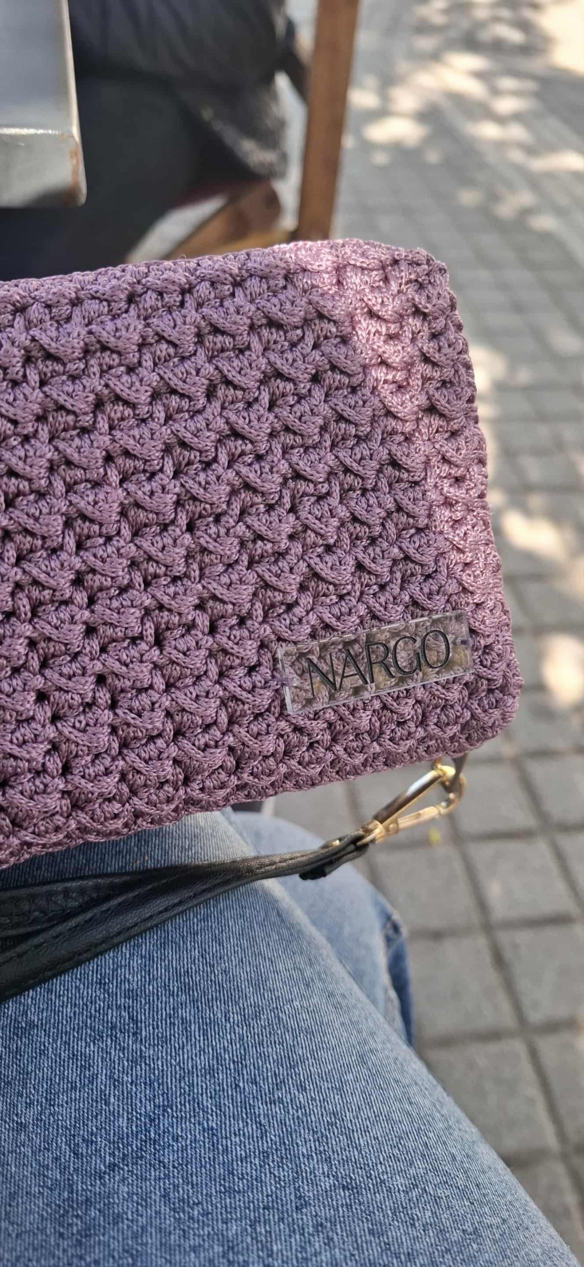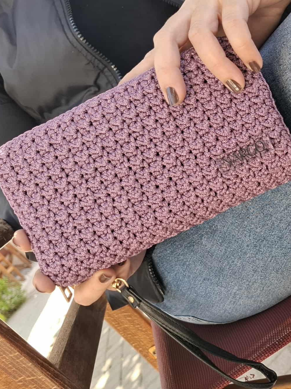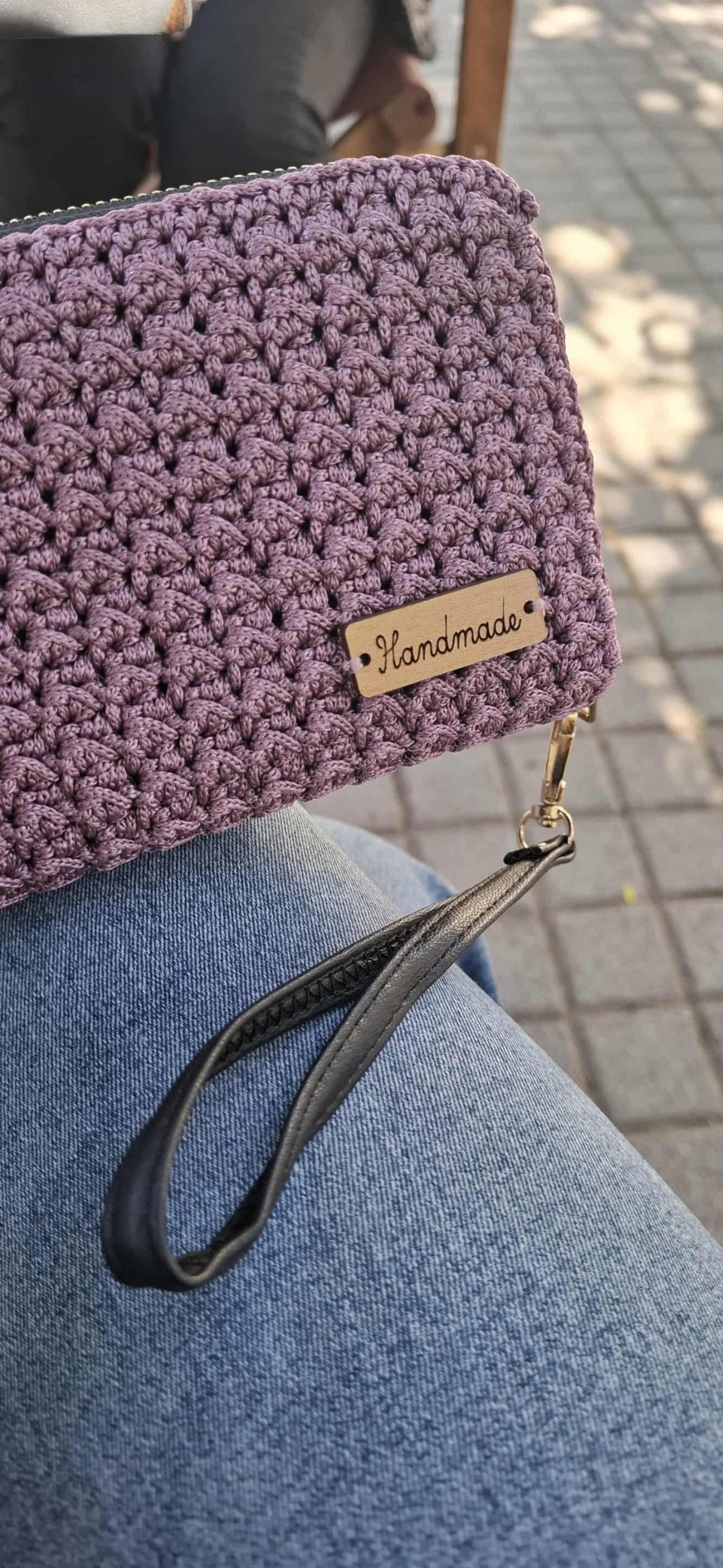 Χειροποίητο πλεκτό μεγάλο πορτοφόλι σε μωβ απόχρωση, με διπλό φερμουάρ και λουράκι καρπού.