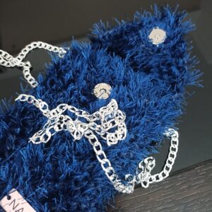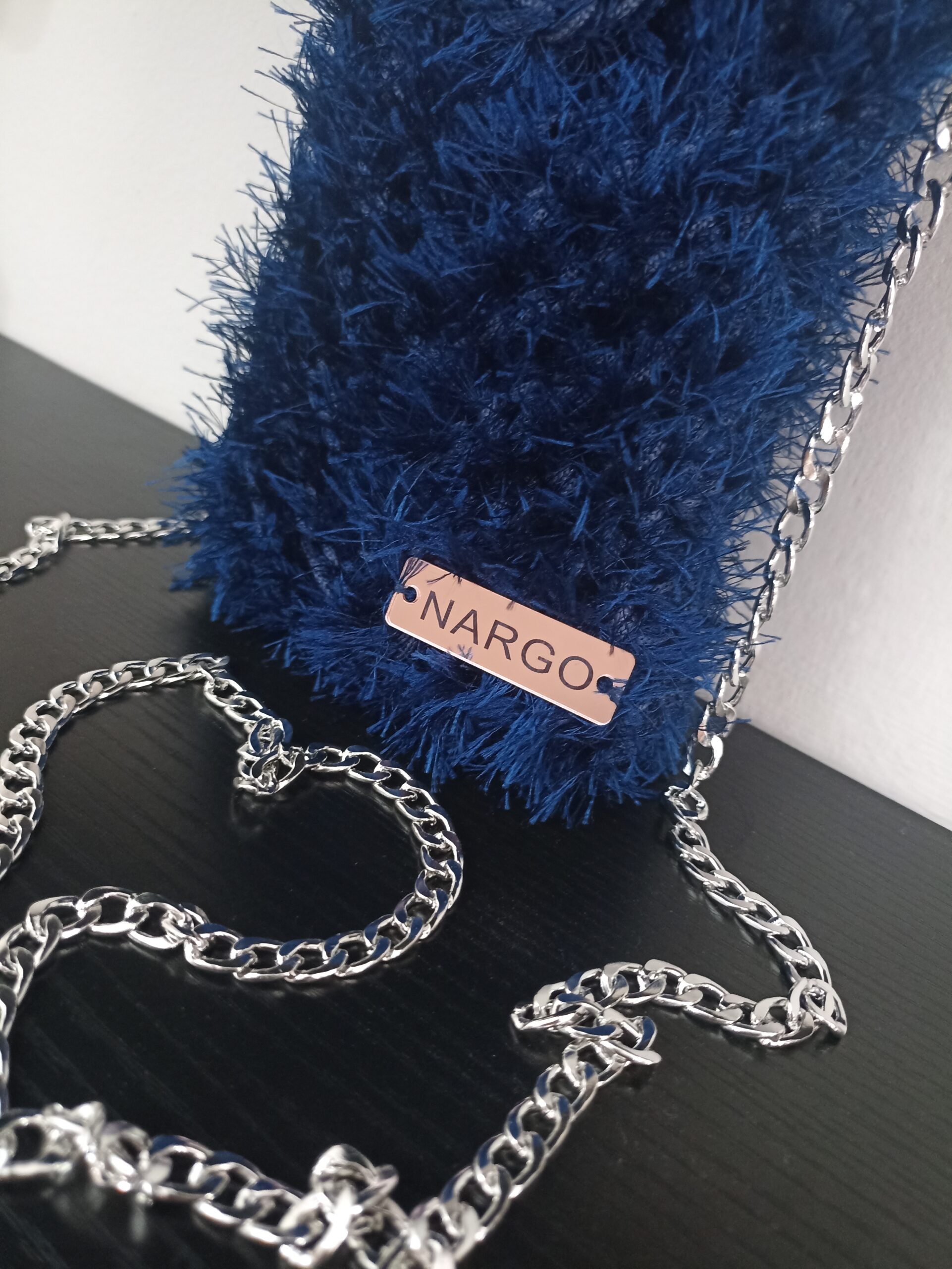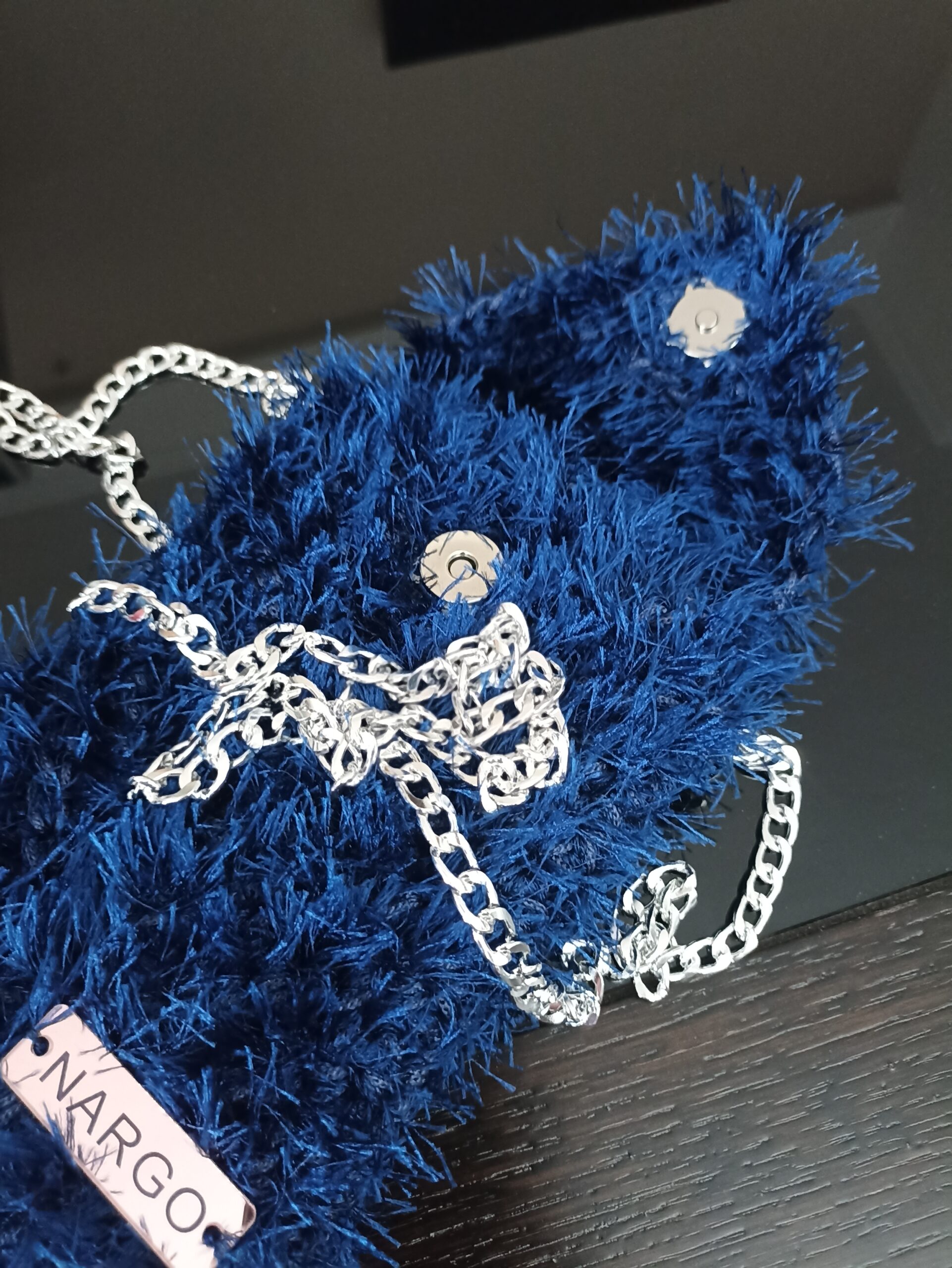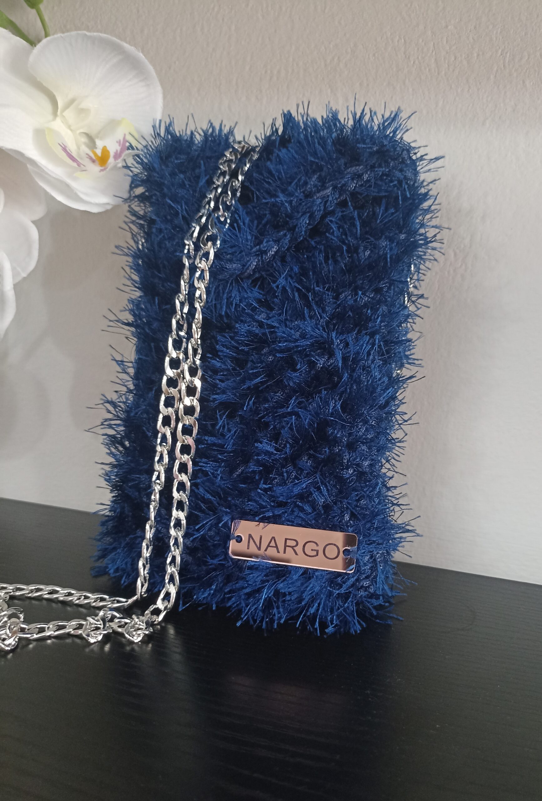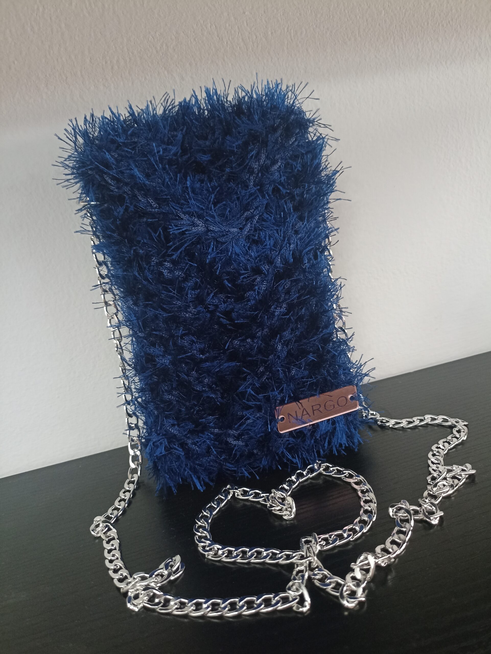 Ένα μπλε ρουά νήμα με χνουδωτή υφή συνδυάστηκε με ένα σταθερό νήμα σε μπλε navy, δημιουργώντας ένα κομψό και πολυτελές τσαντάκι για το κινητό σου — και όχι μόνο!